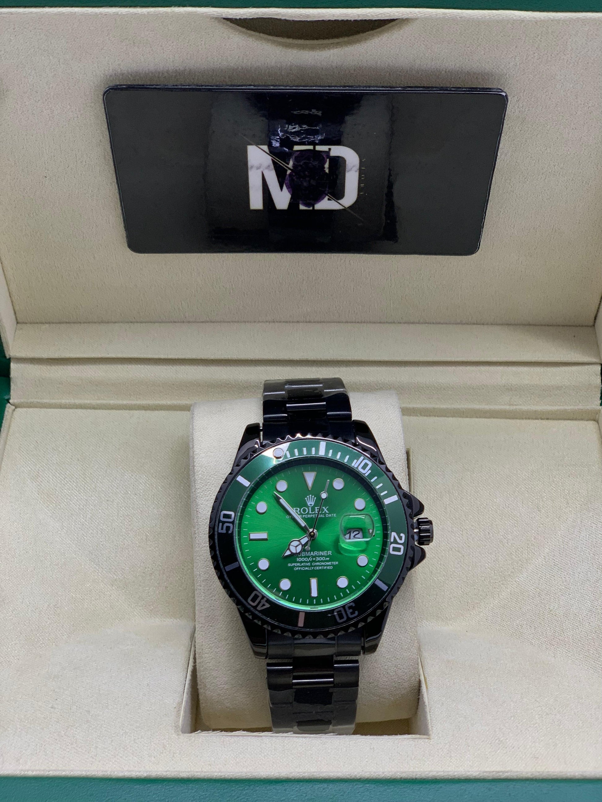 The Rollie Submariner Green is crafted for those who appreciate bold design and sporty luxury. Featuring a striking green dial inspired by classic diver aesthetics, this timepiece delivers strong wrist presence with a clean, modern edge.